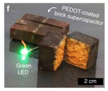 此次,美國圣路易斯華盛頓大學(xué)研究人員朱利奧·達(dá)西及其同事,讓這種紅磚“變身”為一種超級電容器儲能裝置。他們利用磚的多孔結(jié)構(gòu),使用氣相沉積技術(shù)為整塊磚添加了一層名為PEDOT的導(dǎo)電聚合物,讓磚變成一個儲能電極。