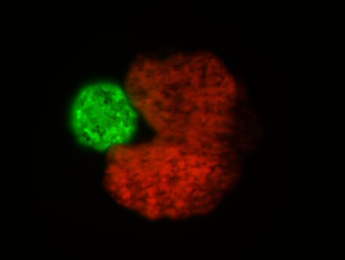 AI設(shè)計(jì)的吃豆人形狀的“母體”生物(紅色),旁邊是被壓縮成球狀的干細(xì)胞——“后代”(綠色)。圖片來源:道格拉斯.布萊克斯頓和山姆.克雷格曼