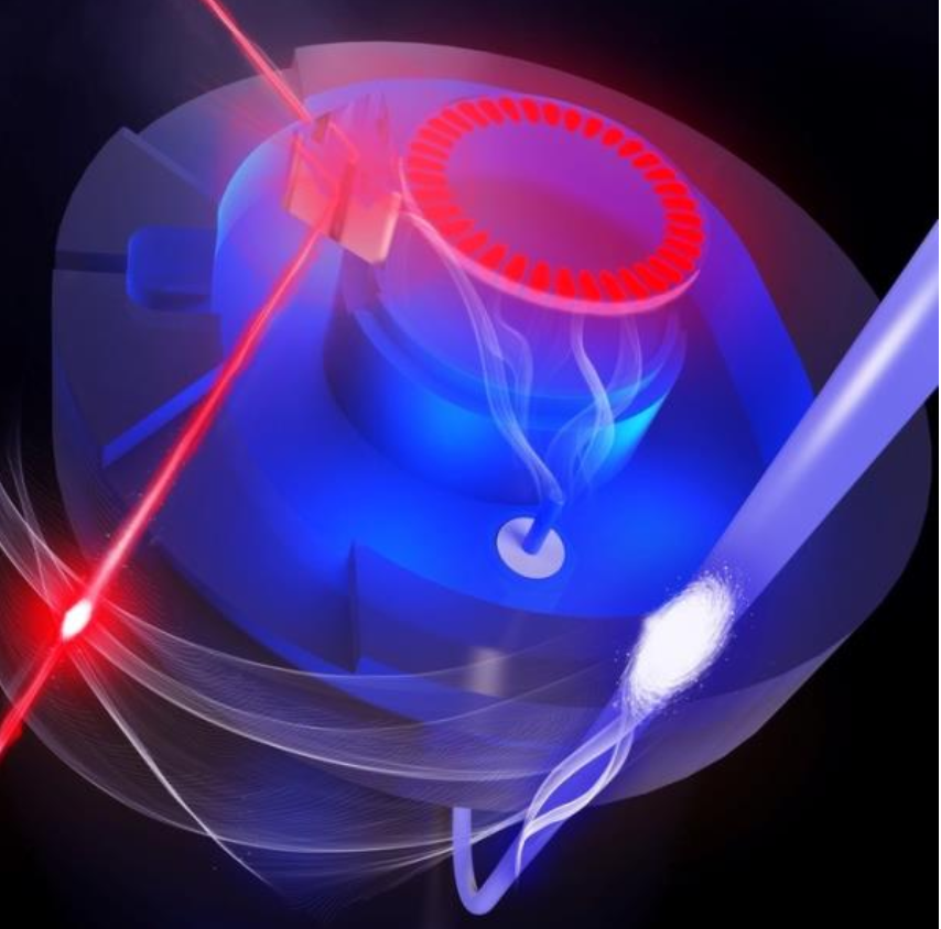 實驗裝置的藝術渲染圖,光束光學光子(紅色)進入和離開電光晶體并在其圓形部分內諧振,以及產生的微波光子(藍色)離開裝置。