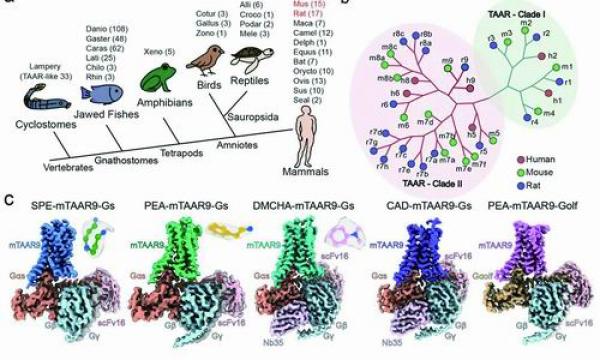 山東大學(xué)教授孫金鵬團隊和上海交通大學(xué)醫(yī)學(xué)院研究員李乾團隊合作,應(yīng)用冷凍電鏡技術(shù)解析了痕量胺相關(guān)受體(TAAR)家族成員之一的小鼠TAAR9(mTAAR9)受體在4種不同配體結(jié)合條件下與Gs/Golf(嗅覺特異性Gα)蛋白三聚體復(fù)合物的結(jié)構(gòu),進一步結(jié)合藥理學(xué)分析揭示了mTAAR9感知配體后被激活的分子機制。同時,該研究也提出了嗅覺受體“組合編碼”識別配體的結(jié)構(gòu)機制,闡明了II類嗅覺受體獨特的激活方式。