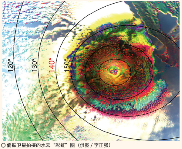 對于液態(tài)水云,在約140度散射角(太陽-云粒子-衛(wèi)星,三者之間的夾角為約40度時)附近的位置具有最強的偏振特性,其他角度的偏振特性會呈現(xiàn)高低波動的趨勢。因此,偏振衛(wèi)星在拍攝水云時,會在不同的散射角等值線處呈現(xiàn)不同的虹圈,140度附近的虹圈最亮,整體看起來就像彩虹一樣。而對于含有冰晶粒子的云,由于粒子形狀不同于水云的球形,散射光的偏振特性會顯著不同,因此偏振衛(wèi)星云圖上可以很好地區(qū)分水云和冰云。