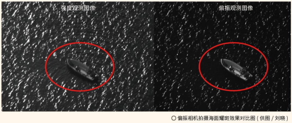 不僅如此,偏振觀測還可以抑制海洋耀斑,提高海面目標(biāo)識別精度。波浪起伏的海面就像一面面破碎的鏡子,當(dāng)太陽光線直射在海面上,衛(wèi)星從特定的角度觀測海面時,會形成大面積的強光反射,即出現(xiàn)耀斑現(xiàn)象。這會導(dǎo)致圖像對比度降低和場景局部信息丟失,影響衛(wèi)星圖像的識別和分析。海面耀斑具有很強的偏振特性,通過旋轉(zhuǎn)偏振片的方法,使偏振片的檢偏方向與耀斑主要偏振方向垂直,對背景耀斑進(jìn)行抑制,從而突出關(guān)鍵目標(biāo)信息。