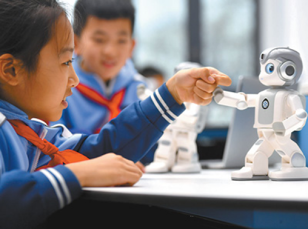 在河北省石家莊市融創(chuàng)中心第一小學(xué),學(xué)生與人工智能設(shè)備進(jìn)行互動。張曉峰攝