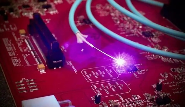 光穿過位于傳統(tǒng)電子電路板上部的光纖。圖片來源:赫瑞—瓦特大學(xué)