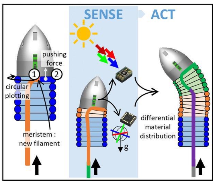 為此,意大利技術(shù)研究院的Emanuela Del Dottore和同事開發(fā)了一種新的藤蔓機器人——FiloBot。它以光線、陰影或重力等為導(dǎo)向因素,通過熔化和擠壓塑料絲線將其纏繞成圓柱形,再冷卻固化,從而“打印”出自己的身體,即生長。機器人頭部通過一根細(xì)軟管連接在基座上,用于“打印”自身的塑料材料通過軟管被輸送上來。
