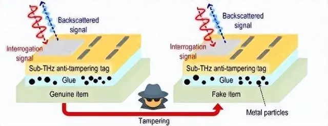 新的防篡改標簽具有一系列微槽,使太赫茲波能夠穿過標簽,并擊中混合在膠水中的微小金屬顆粒。太赫茲波有足夠的靈敏度,可以探測到粒子。此外,使用波長為1毫米的太赫茲波,研究人員可以制造出不需要更大的片外天線的芯片。在穿過標簽并擊中物體表面后,太赫茲波被反射或反向散射到接收器進行驗證。