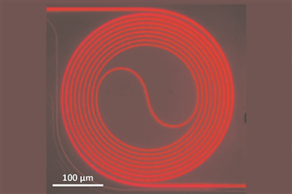 此次,研究人員首先在二氧化硅平臺(tái)上鋪了一層大塊的鈦藍(lán)寶石;再將鈦藍(lán)寶石研磨、蝕刻和拋光成極薄的一層,只有幾百納米厚;然后,在該薄層上設(shè)計(jì)出一個(gè)由微小脊線組成的漩渦。這些脊線就像光纖電纜,引導(dǎo)光線不斷循環(huán),強(qiáng)度逐漸增強(qiáng)。這種模式被稱為波導(dǎo)。