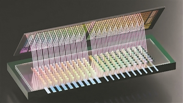 研究團(tuán)隊(duì)最新研制的這款三維芯片面積僅0.3平方毫米,其上集成了80個(gè)高密度的光子發(fā)射器和接收器,能提供800吉字節(jié)/秒的超高數(shù)據(jù)傳輸帶寬以及每傳輸1比特?cái)?shù)據(jù)僅消耗120飛焦耳的卓越能效。