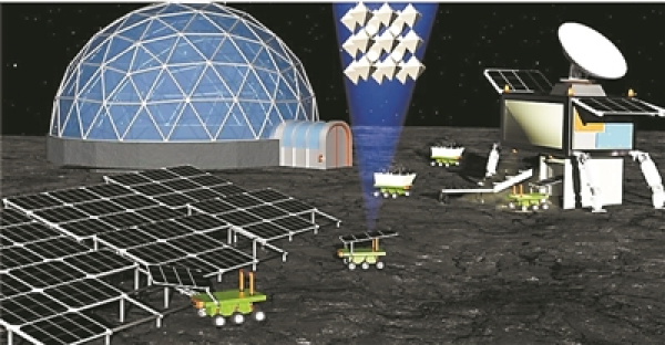 利用原始風(fēng)化層在月球上制造太陽能電池的模擬圖。圖中機(jī)器人負(fù)責(zé)獲取原始風(fēng)化層并將其運(yùn)送到生產(chǎn)設(shè)施,安裝生產(chǎn)后的太陽能電池可為未來月球棲息地甚至城市供電。圖片來源:德國波茨坦大學(xué)