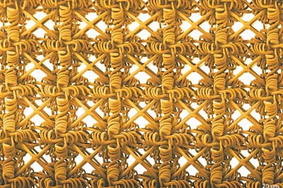 在超材料設(shè)計(jì)領(lǐng)域,“越強(qiáng)越好”一直是主導(dǎo)規(guī)則。超材料是一種具有微觀結(jié)構(gòu)的合成材料,能夠賦予材料整體卓越的性能。然而,追求更強(qiáng)硬度的同時(shí)往往犧牲了材料的柔韌性。為了解決這一問(wèn)題,團(tuán)隊(duì)設(shè)計(jì)了一種結(jié)合堅(jiān)硬的微觀支撐結(jié)構(gòu)和更柔軟的編織結(jié)構(gòu)的“雙網(wǎng)絡(luò)”。這種新材料由類似有機(jī)玻璃的聚合物制成,能夠拉伸至自身尺寸的4倍以上而不會(huì)斷裂,而其他形式的聚合物幾乎沒(méi)有拉伸性。
