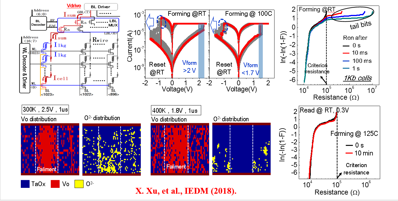 對(duì)于新型存儲(chǔ)器RRAM,初始電形成過程會(huì)增加電路設(shè)計(jì)復(fù)雜度,帶來可靠性問題,一直是工業(yè)界和科研界研究的熱點(diǎn)。劉明院士團(tuán)隊(duì)在RRAM方向的研究具有豐富的經(jīng)驗(yàn),針對(duì)28納米的1Mb RRAM測(cè)試芯片(IEDM 2017 2.4.1),提出了高溫forming的編程方法,可以將平均forming電壓從2.5V以上降為1.7V。由于高溫forming過程中細(xì)絲內(nèi)殘留的氧離子大幅減少,編程之后由于氧離子和氧空位復(fù)合造成的電阻弛豫效應(yīng)得到消除,器件的保持特性得到了40以上的大幅提升。