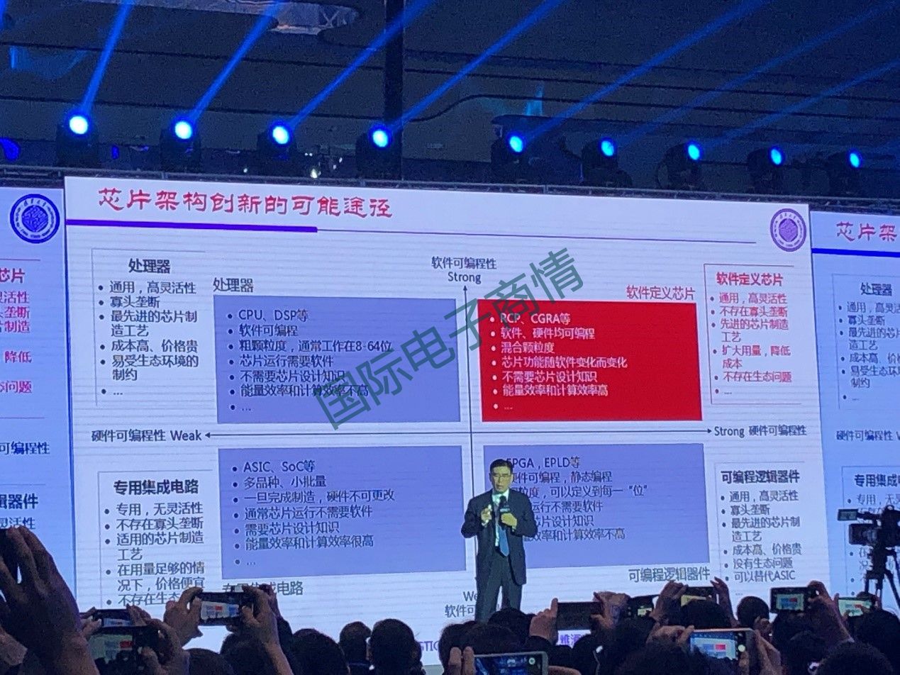 另外,魏教授還談到‘軟件定義芯片’的話題,他從軟、硬件的可編程性來(lái)切入。“最好的架構(gòu)能解決能量效率的問(wèn)題,什么樣的芯片具備這樣的架構(gòu)?我們把軟、硬件的可編程性分為四個(gè)象限。傳統(tǒng)的CPU、DSP在第二象限,專用集成電路在第三象限,F(xiàn)PGA、EPLD在第四象限。第一個(gè)象限具備很好的軟、硬件可編程性,如果這兩者都成立,就是‘軟件定義芯片’。”