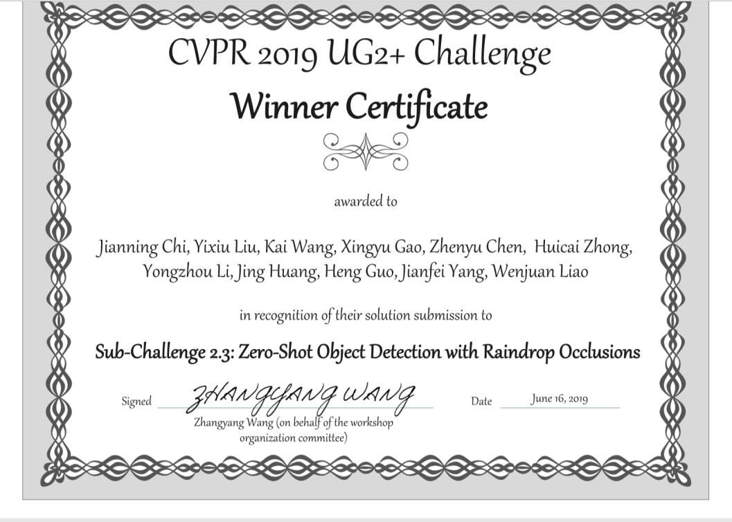 UG2+競(jìng)賽由CVPR、政府機(jī)構(gòu)、計(jì)算機(jī)視覺領(lǐng)域權(quán)威學(xué)術(shù)機(jī)構(gòu)以及知名企業(yè)共同舉辦,其主旨是挑戰(zhàn)和探索計(jì)算機(jī)視覺領(lǐng)域極端困難條件下的檢測(cè)和識(shí)別類算法任務(wù)。目標(biāo)檢測(cè)是計(jì)算機(jī)視覺領(lǐng)域的基礎(chǔ)研究方向之一,本屆比賽提出低可見環(huán)境(雨、霧、低亮度等)下的目標(biāo)檢測(cè)和識(shí)別挑戰(zhàn)任務(wù)。當(dāng)前主流目標(biāo)檢測(cè)算法大都基于通用檢測(cè)框架,例如Resnet50、Inception、VGG19、Faster-RCNN、FPN等,并不能完全適配實(shí)際應(yīng)用場(chǎng)景中存在的復(fù)雜性、低圖像質(zhì)量和強(qiáng)干擾等條件。鑒于此因,競(jìng)賽組委會(huì)提供了總計(jì)上萬(wàn)張復(fù)雜、模糊的真實(shí)圖片數(shù)據(jù)集,用以探索最具精確性和魯棒性的算法。微電子所和中科深微組建的Sunway.AI聯(lián)隊(duì)奪得了“具有雨滴遮擋的零樣本目標(biāo)檢測(cè)”冠軍,物聯(lián)網(wǎng)中心、自動(dòng)化所、贏識(shí)科技聯(lián)隊(duì)奪得“弱光線場(chǎng)景下的(半)監(jiān)督人臉檢測(cè)”冠軍,國(guó)科大微電子學(xué)院與東北大學(xué)聯(lián)隊(duì)奪得“視頻目標(biāo)檢測(cè)增強(qiáng)”和“視頻目標(biāo)分類增強(qiáng)”兩個(gè)子項(xiàng)冠軍。