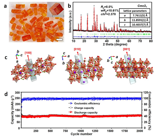 圖:新型鉀電正極材料的晶體及物相表征(a,b)、晶體結(jié)構(gòu)分析(c)以及長循環(huán)性能測試曲線(d)