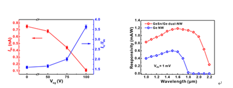 上海微系統所研究人員利用分子束外延技術,成功制備出大面積、高密度且高長寬比的Ge納米線,并利用其作為模板,通過二次沉積法獲得了Sn組分可達~10%的GeSn/Ge雙層納米線結構。由于納米線具有柔性且極高的比表面積,能夠通過彈性形變的方式自主弛豫釋放GeSn/Ge之間晶格失配引入的應力,從而有效抑制GeSn/Ge界面處的缺陷形成。由于GeSn具有較窄的禁帶寬度,因此基于GeSn/Ge雙層納米線的光電探測器件比Ge納米線光電探測器具有更長的探測波長,延伸到2 μm以上。為了抑制窄禁帶寬度GeSn引起的暗電流增加,研究人員進一步引入具有鐵電性的P(VDF-TrFE)離子膠作為柵介質,通過側柵調控大幅降低了GeSn/Ge雙層納米線光電探測器的暗電流與靜態功耗,從而實現了兼具長波長與低暗電流的光電探測,對于拓展Ⅳ族材料納米線結構在光電探測領域的研究與應用具有重要參考意義。