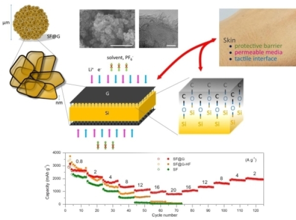 近年來,國家納米科學(xué)中心李祥龍、智林杰團(tuán)隊(duì)從低成本的二氧化硅納米顆粒出發(fā),改進(jìn)鎂熱還原技術(shù)、規(guī)模化制備一種仿繡球形態(tài)的硅烯材料,應(yīng)用于鋰離子電池時(shí)展現(xiàn)出優(yōu)異的綜合儲(chǔ)鋰性能。近期,研究團(tuán)隊(duì)提出并發(fā)展一種“植皮式”二維共價(jià)封裝策略,基于繡球狀硅烯進(jìn)一步制備硅氧碳鍵基繡球狀共價(jià)雙烯,表現(xiàn)出很好的綜合儲(chǔ)鋰性能:在800 mA/g的電流密度下重量與體積比容量分別高達(dá)2646 mAh/g和2350 mAh/cm3,在2000 mA/g的電流密度下循環(huán)500次后重量比容量仍保持近1500 mAh/g;即使在20000 mA/g的電流密度下重量比容量仍高達(dá)810 mAh/g,體積比容量相比非共價(jià)封裝和未封裝材料分別高出1358%和1442%;以整體器件計(jì)算,基于該碳硅材料的全電池能量密度比基于石墨的高出40%~60%,比目前的商業(yè)化鋰離子電池的比能量和能量密度均高出40%以上。初步研究表明,二維共價(jià)封裝策略在有效緩解硅體積膨脹的情況下,不僅提供了電子/鋰離子高效混合傳輸通道,還變革材料界面、確保了電子/鋰離子高效且穩(wěn)定傳輸。