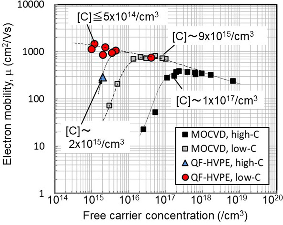 在低 QF-HVPE工藝中發(fā)現(xiàn)了最高的遷移率1470cm2/V-s,其自由電子密度非常低,僅為1.2x1015/cm3。這是迄今為止GaN晶體報道的最高室溫遷移率。