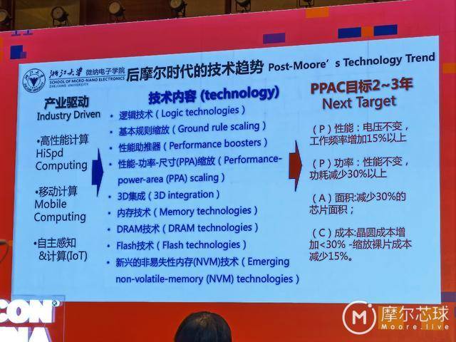 他強(qiáng)調(diào),如下圖所示,在后摩爾時(shí)代,在高性能計(jì)算、移動(dòng)計(jì)算和自主感知等應(yīng)用的推動(dòng)下,我們應(yīng)該增加對(duì)邏輯技術(shù)、基本規(guī)則縮放、性能助推器、PPA縮放、3D集成、內(nèi)存技術(shù)、DRAM技術(shù)、Flash技術(shù)和新興非易失存儲(chǔ)技術(shù)的關(guān)注,已達(dá)到如下圖所示的PPAC目標(biāo)。