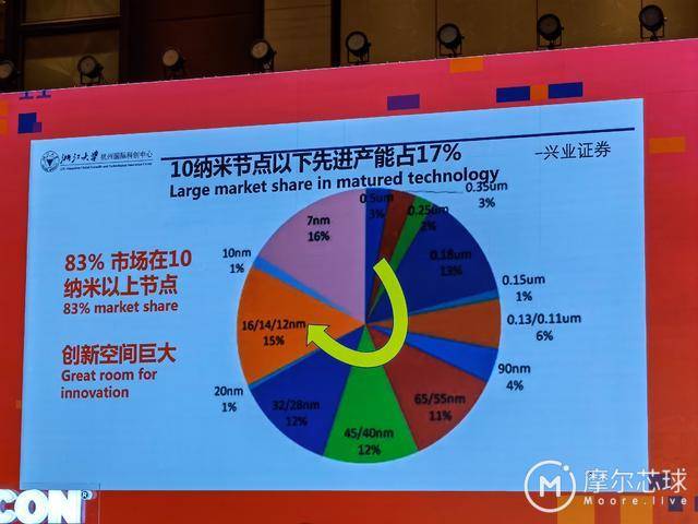 吳漢明院士同時(shí)還指出,如下圖所示,現(xiàn)在83%以上的芯片產(chǎn)能集中在10納米以上節(jié)點(diǎn),為此在他看來,在這些所謂的舊節(jié)點(diǎn)上,還有很大的創(chuàng)新空間。