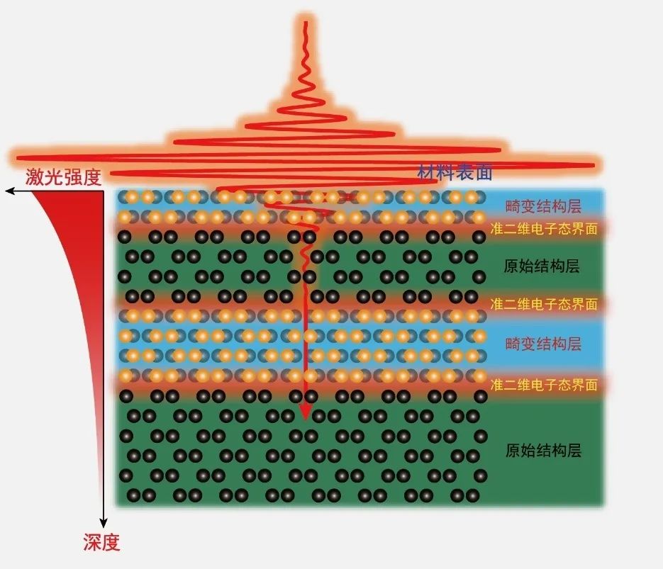 二維電子態(tài)通常通過機(jī)械剝離、人工異質(zhì)結(jié)、分子束外延生長等方法制造人工結(jié)構(gòu)來實(shí)現(xiàn)。在該研究中,科學(xué)家提出并實(shí)現(xiàn)了在量子材料中利用超快激光調(diào)控產(chǎn)生二維電子態(tài)的新方法。論文通訊作者張文濤告訴《中國科學(xué)報(bào)》,該方法利用在特定激光強(qiáng)度下激發(fā)相干電子—聲子相互作用所引起的材料晶格宏觀周期性畸變,并且這種晶格畸變在材料中分層出現(xiàn),在晶格畸變層與原始層之間實(shí)現(xiàn)了一種長程有序的二維電子態(tài)。