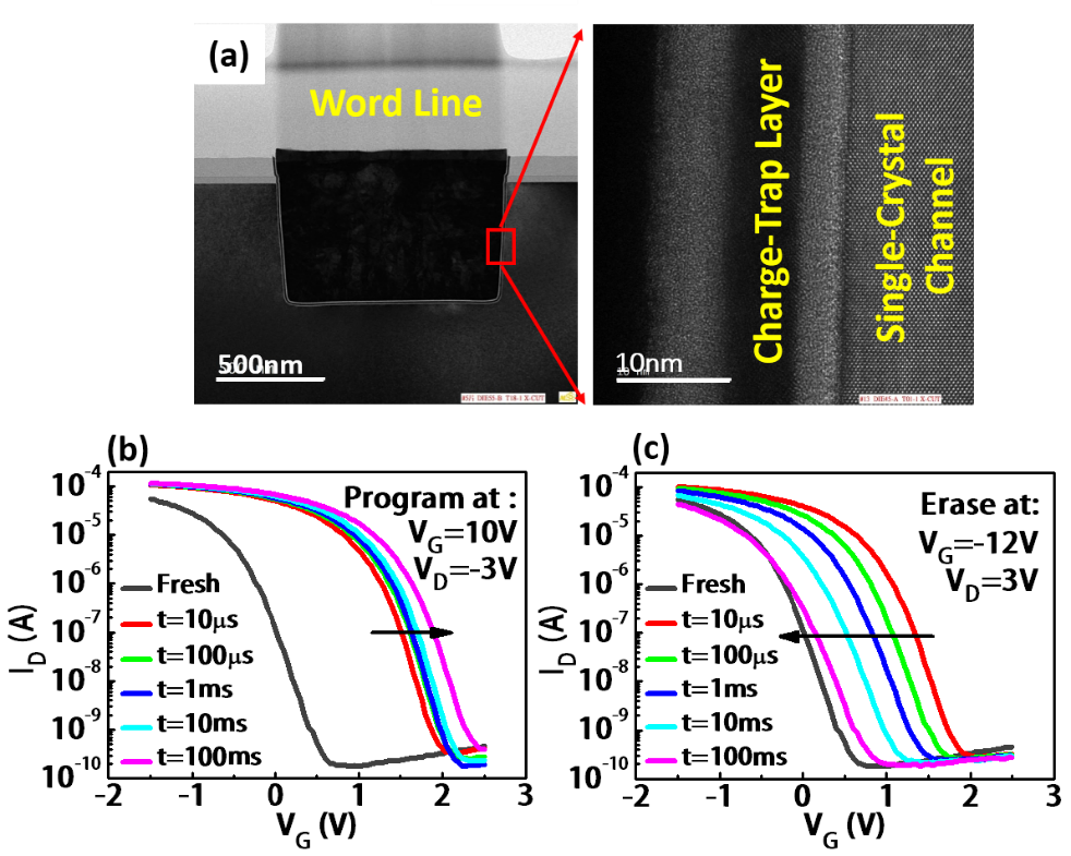 圖2. 單晶硅溝道3D NOR器件及電性實(shí)驗(yàn)結(jié)果:(a)器件TEM截圖(左)及溝道局部放大圖(右),(b)編程特性和(c)擦除特性