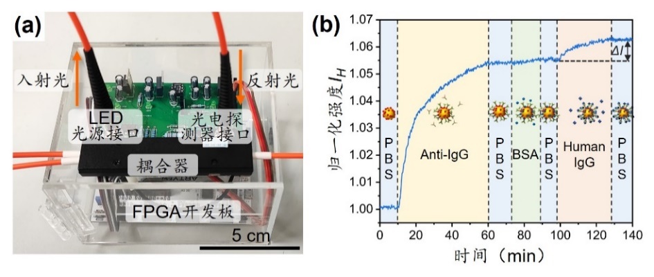 圖 2 小型化、便攜式光纖傳感系統及其生化檢測性能(a)系統照片,(b)IgG檢測的響應曲線