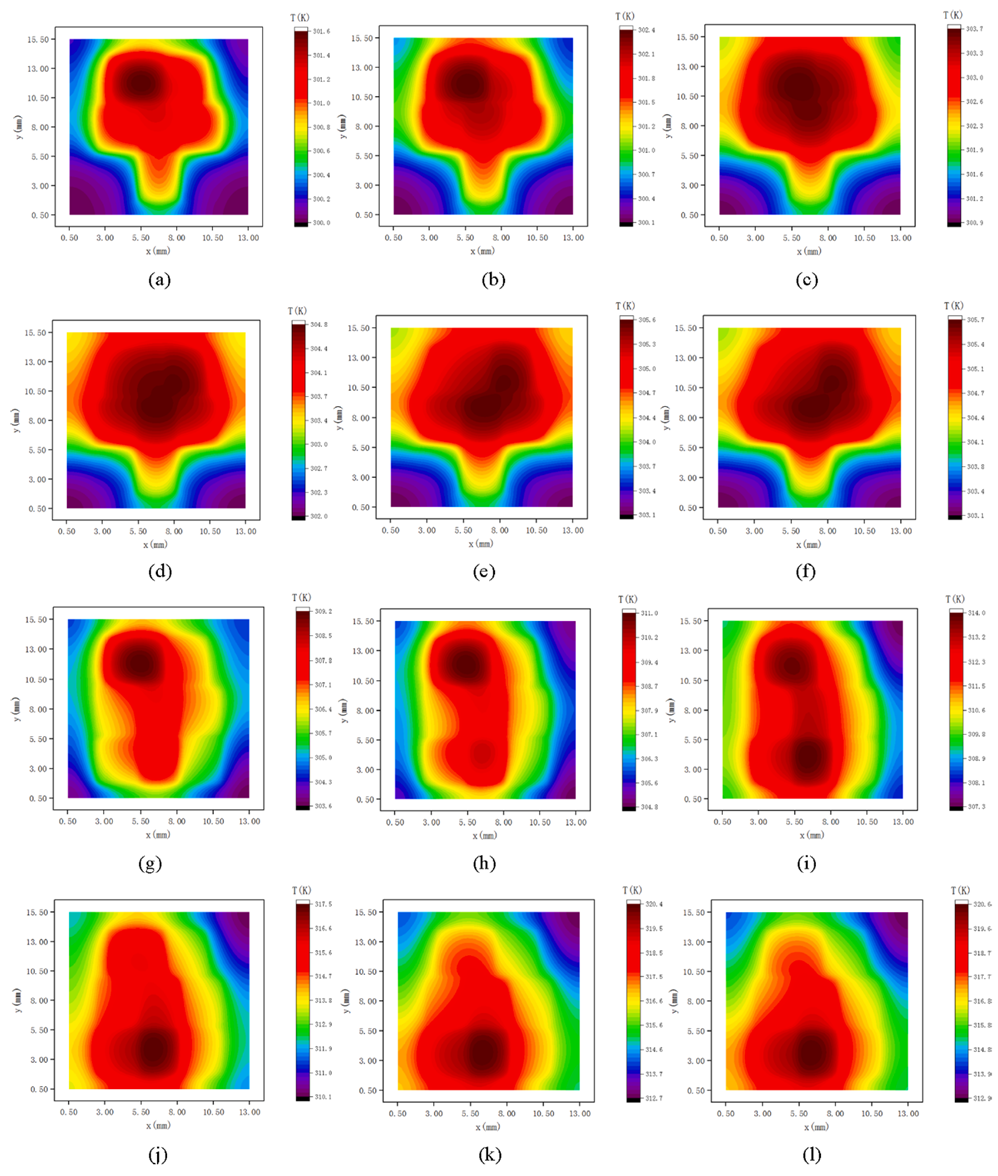 圖2 一個典型Chiplet異構集成系統中介層上表面瞬態溫度分布: (a) t = 0.1 s; (b) t = 0.2 s; (c) t = 0.5 s; (d) t = 1.0 s; (e) t = 3.0 s; (f) t = 5.0 s; ((a)-(f):狀態1) (g) t = 5.1 s; (h) t = 5.2 s; (i) t = 5.5 s; (j) t = 6.0 s; (k) t = 8.0 s; (l) t = 10.0 s. ((g)-(l):狀態2)