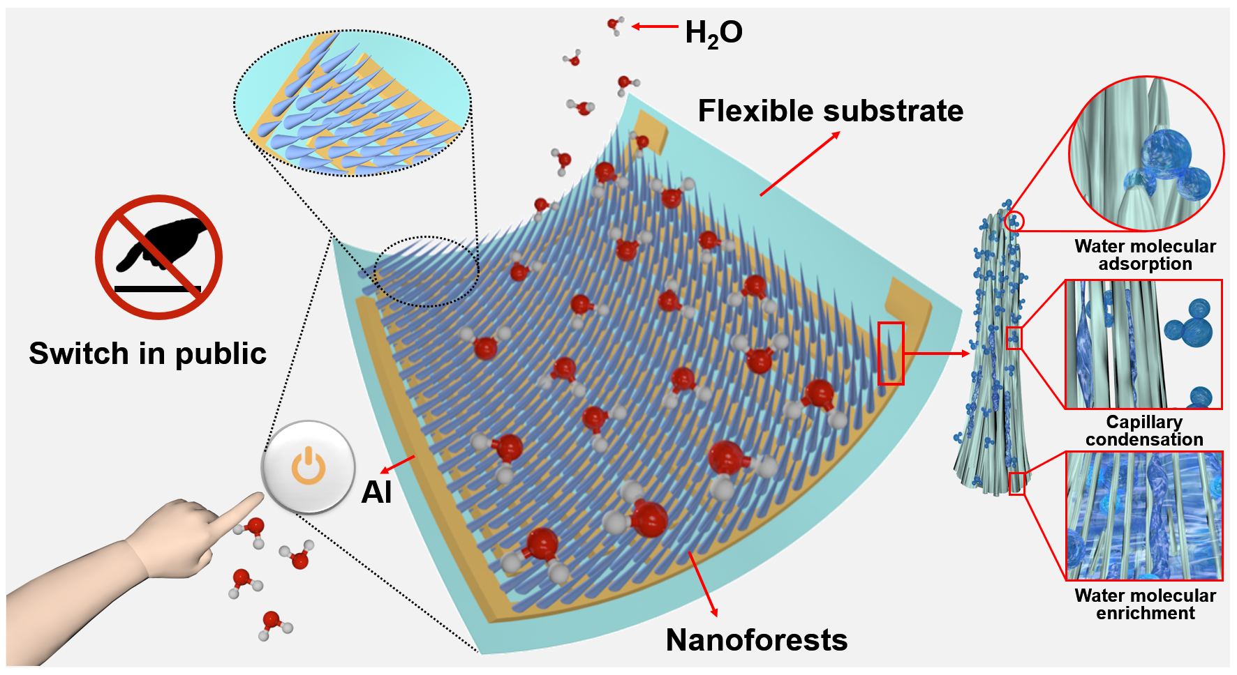 研究團隊成功研制出一種柔性透明的高性能濕度傳感器。該傳感器以納米森林為濕敏材料,制備工藝簡單便捷,具備晶圓級圖形化、大批量制備能力。所制備的濕度傳感器具有出色的靈敏度、快速響應能力、長期穩(wěn)定性和良好的機械靈活性。基于濕度傳感器的以上優(yōu)異特性,研究團隊進一步實現(xiàn)了該器件的非接觸式智能開關(guān)應用。