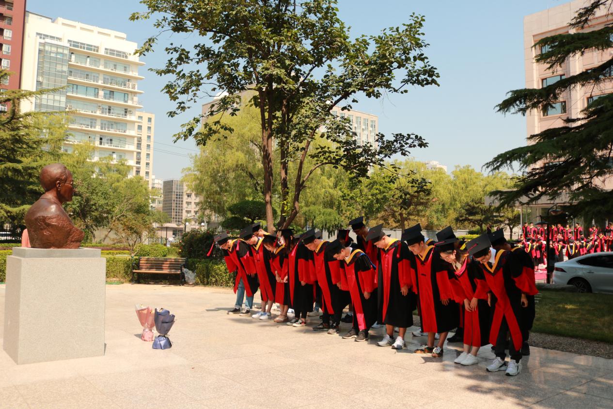 在撥穗儀式上,畢業生們身穿學位服,莊重的向王守武先生雕像深深鞠躬,并接受導師們的撥穗,寓意著畢業生們將不忘科學先輩精神、牢記恩師囑托,在各自新的領域展翅高飛、揚帆起航。