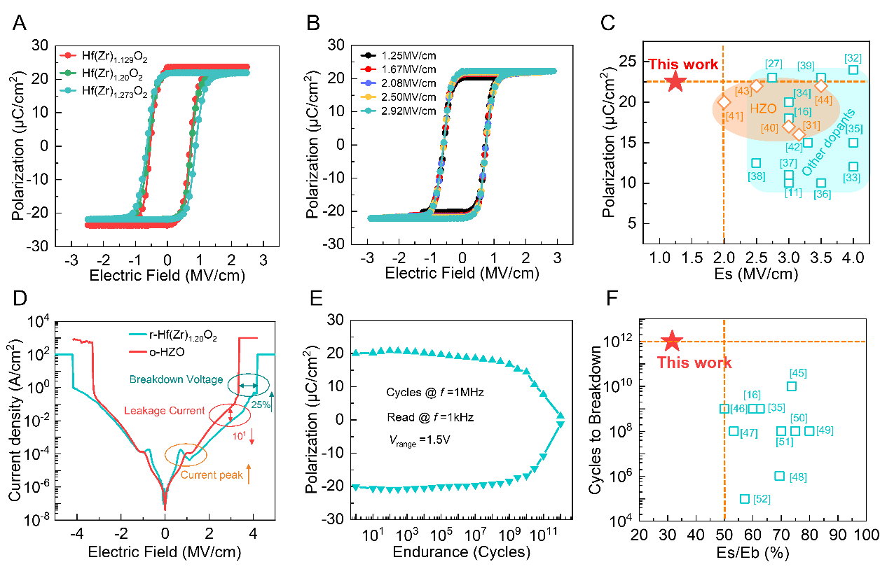 針對這一問題,微電子器件與集成技術重點實驗室劉明院士團隊與中國科學院物理所杜世萱研究員團隊合作,發現了一種穩定的鐵電三方相Hf(Zr)1+xO2材料結構,這種結構降低了HfO2基鐵電材料中鐵電偶極子的翻轉勢壘。通過基于密度泛函理論(DFT)的第一性原理計算發現,當Hf(Zr)1+xO2材料中,Hf(Zr)與氧的比例大于1.079:2時,三方相的形成能低于鐵電o相和單斜相(m相)的形成能。掃描透射電子顯微鏡(STEM)實驗清晰顯現了過量Hf(Zr)原子嵌入在鐵電三方相晶格的晶體結構,證實了理論計算的結果。嵌入的Hf(Zr)原子擴展了晶格,增加了其面內和面外應力,起到了穩定Hf(Zr)1+xO2材料結構和降低其鐵電翻轉勢壘的作用。基于Hf(Zr)1+xO2薄膜的鐵電器件展示了超低矯頑場(~0.65MV/cm)、高剩余極化(Pr)值(22μC/cm2的)、小的飽和極化電場(1.25MV/cm)、和大的擊穿電場(4.16MV/cm),并在飽和極化下實現了1012次循環的耐久性。這一研究結果為低功耗、低成本、長壽命的存儲器芯片提供了一種有效的解決方案。?