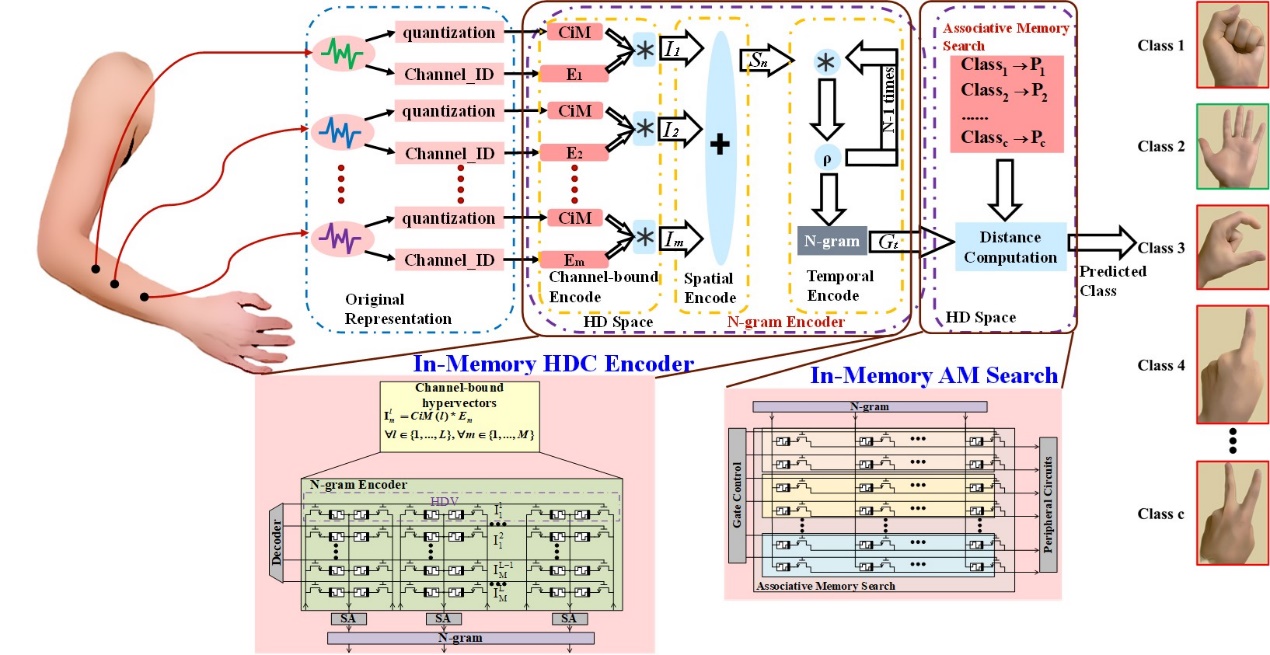 針對這一問題,微電子所微電子器件與集成技術研發(fā)中心劉明院士團隊的尚大山研究員與香港大學合作,基于阻變存儲器(RRAM)的存內(nèi)計算范式,開發(fā)了面向時空信號處理的存內(nèi)高維計算編碼技術。團隊采用2T2R(兩個晶體管與兩個RRAM為一個單元)陣列作為存內(nèi)高維計算的編碼器,通過在編碼器中原位執(zhí)行綁定和捆綁操作,并通過設計簡單的外圍電路進行重排操作,實現(xiàn)了對時空信號的編碼。該方法利用電阻分壓原理映射超向量的元素,避免了矩陣—向量乘法過程中的陣列會聚電流過大的問題。此外,團隊采用1T1R陣列作為關聯(lián)記存儲器。在訓練階段,每個類別編碼后的超向量通過疊加構(gòu)成該類的原型向量,并預先存儲至關聯(lián)記憶存儲器中。在推理階段,輸入的時空信號首先被編碼為查詢超向量,然后以存內(nèi)搜索的方式與關聯(lián)記憶存儲器中的類原型向量進行相似度計算。具有最大相似度的類即為預測結(jié)果。該設計在基于腦肌電信號的手勢識別任務中實現(xiàn)了97.96%的識別率。40nm工藝節(jié)點仿真結(jié)果表明該設計具有高魯棒、高通量、低延時等優(yōu)勢,同時計算能效相較于當前的已報道的高維計算編碼器提升了39倍。這項研究結(jié)果為在資源有限的邊緣系統(tǒng)實現(xiàn)對時空信號的實時處理提供了一種高效的解決方案。