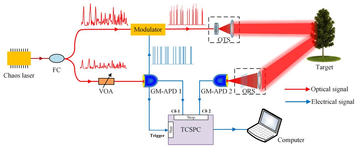 單光子激光探測(cè)技術(shù)是當(dāng)前研究熱點(diǎn),具有光子級(jí)靈敏度、0/1輸出和易于陣列化等特性,從根本上提高了對(duì)光信號(hào)的利用率并改變了數(shù)據(jù)處理方式。團(tuán)隊(duì)針對(duì)單光子探測(cè)技術(shù)中光子級(jí)靈敏度易受噪聲干擾等問(wèn)題,建立探測(cè)理論模型指導(dǎo)系統(tǒng)設(shè)計(jì)工作。依托原有光子計(jì)數(shù)激光雷達(dá)開(kāi)發(fā)經(jīng)驗(yàn),在國(guó)際上首次提出了利用單光子雪崩光電二極管(Single photon avalanche diode,SPAD)探測(cè)器響應(yīng)物理隨機(jī)的光混沌信號(hào)產(chǎn)生真隨機(jī)序列,通過(guò)物理隨機(jī)編碼技術(shù)實(shí)現(xiàn)了高效且強(qiáng)魯棒特性的混沌單光子探測(cè)。該系統(tǒng)相較于傳統(tǒng)脈沖累積單光子激光雷達(dá)與偽隨機(jī)編碼單光子激光雷達(dá),在解決了去模糊距離問(wèn)題后,其抗干擾、抗串?dāng)_等指標(biāo)也有著顯著提升。相關(guān)研究成果系統(tǒng)設(shè)計(jì)與性能分析研究成果分別發(fā)表在“Applied Optics:Improving the ranging performance of chaos LiDAR”、“Optics Express:Chaos single photon Lidar and the ranging performance analysis based on Monte Carlo simulation”、“Optics and Laser Technology:Efficient and robust chaos single photon lidar”、“集成技術(shù):數(shù)字混沌激光雷達(dá)”等期刊。
