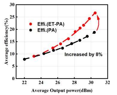 圖3 包絡(luò)跟蹤功率放大器效率提升曲線(對(duì)比F類功率放大器)