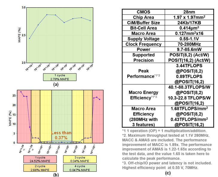 圖1(a)不同數(shù)據(jù)區(qū)間POSIT8近似計(jì)算誤差, (b)不同數(shù)據(jù)區(qū)間POSIT16近似計(jì)算誤差, (c)芯片性能總結(jié)表格