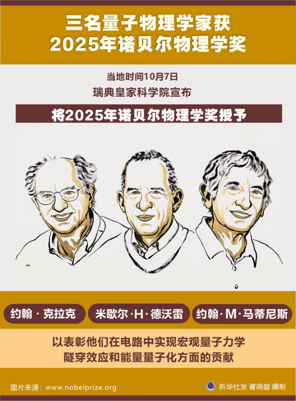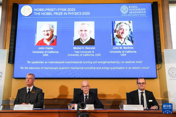 在量子力學(xué)誕生百年之際,瑞典皇家科學(xué)院7日宣布,將2025年諾貝爾物理學(xué)獎授予約翰·克拉克、米歇爾·H·德沃雷和約翰·M·馬蒂尼斯三名量子物理學(xué)家,以表彰他們在電路中實現(xiàn)宏觀量子力學(xué)隧穿效應(yīng)和能量量子化方面的貢獻。