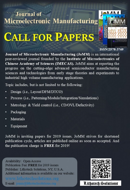JoMM aims at reporting the progress on the cutting-edge advanced semiconductor manufacturing sciences and technologies from early stage theories and experiments to industrial high volume manufacturing applications. Topic includes, but is not limited to Design, Process, Metrology & Yield Control, Packaging, Materials, Equipment. JoMM strives for shortened publication cycle, articles are published online for reading, downloading and citing as soon as accepted. Now JoMM is inviting papers for 2019 issues, and the publication charge is free. For more details, please visit www.lithotechsolutions.org.