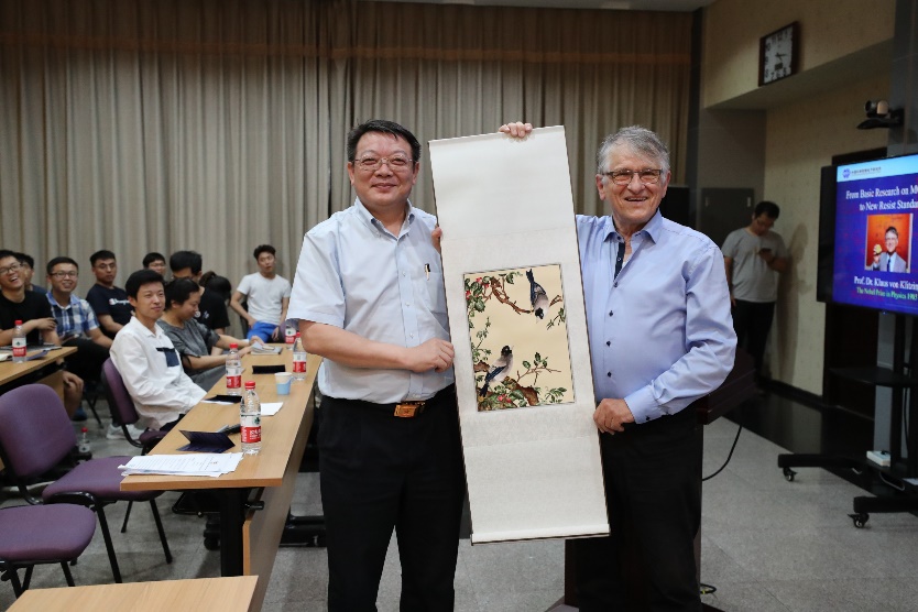 Klaus von Klitzing教授分享了獲得諾貝爾物理學(xué)獎(jiǎng)的成果。在進(jìn)行霍爾效應(yīng)實(shí)驗(yàn)時(shí),他觀測(cè)到霍爾電阻不按線性關(guān)系變化,而隨著磁場(chǎng)強(qiáng)度的增大而做階梯式變化。進(jìn)過分析計(jì)算,得到其霍爾電阻值為h/(e2f ),h為普朗克常量,e為基本電荷,f為填充因子。這樣在器件上測(cè)量量子化霍爾電阻是當(dāng)今最穩(wěn)定最易于復(fù)現(xiàn)的電阻器,與器件參數(shù)無(wú)關(guān),量子霍爾電阻成為了電阻定義的標(biāo)準(zhǔn)。此后的瓦特天平借由量子霍爾效應(yīng)與約瑟夫森效應(yīng)精確測(cè)得的電阻與電勢(shì),使標(biāo)準(zhǔn)的質(zhì)量、長(zhǎng)度、時(shí)間等基本物理量間建立聯(lián)系,借助這一方法,就能以非常高的精度測(cè)量普朗克常數(shù)的值。在這基礎(chǔ)上,實(shí)現(xiàn)了以普朗克常數(shù)重新定義的“千克”單位。與會(huì)人員就相關(guān)問題同Klaus von Klitzing 教授進(jìn)行了深入交流。