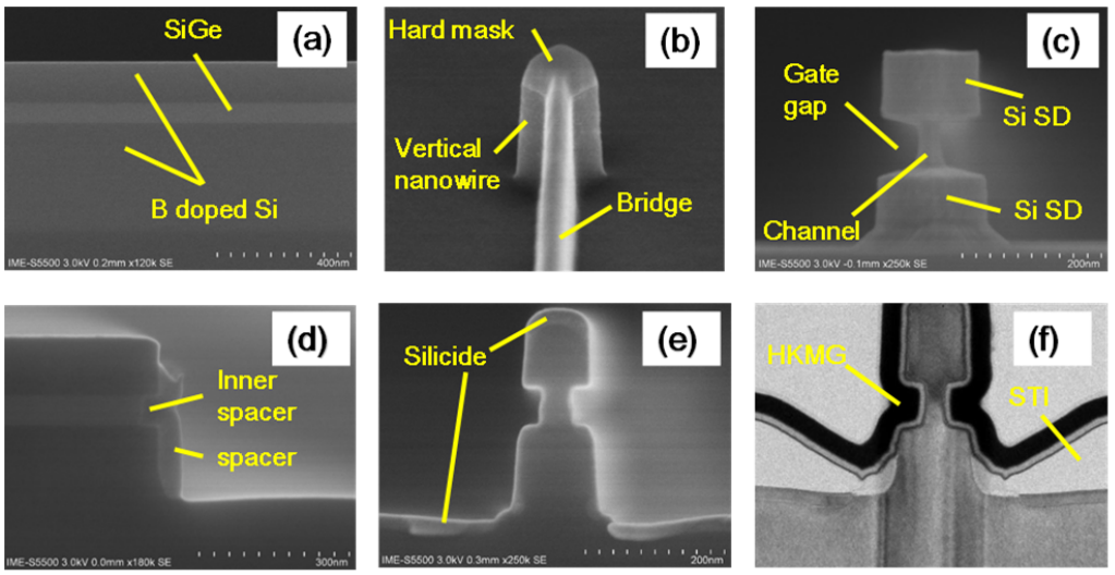 器件形貌圖(a-e為SEM圖像,f為TEM圖像):(a)外延生長后;(b)RIE后傾斜視角3D結(jié)構(gòu);(c)qALE后;(d);隔離層成型后;(e)金屬硅化物工藝后;(f)HKMG沉積后。
