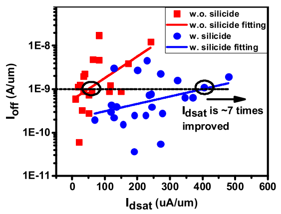 Ioff-Idsat散布圖,圖中w.o./w.表示without/with可見通過Ni(Pt)硅化物工藝改進后的開關(guān)電流提升到7倍