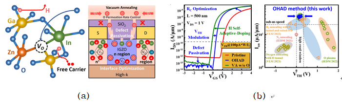 圖1 (a)IGZO氧輔助氫自適應摻雜方法與器件優化機制,(b)性能與均一性優化示意圖