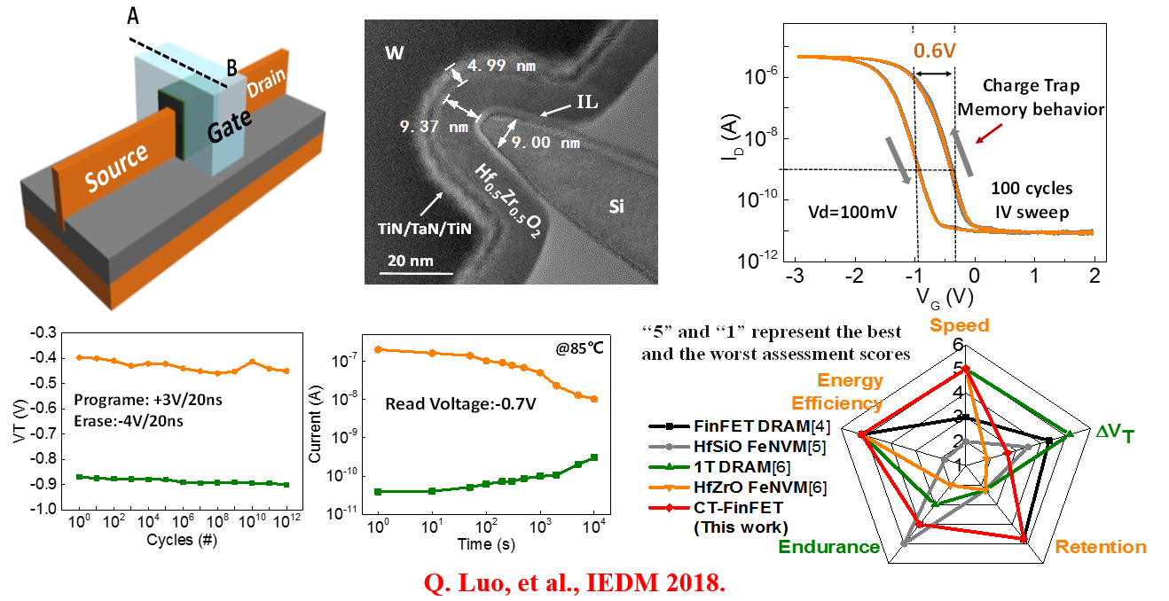 圖2. 基于HfZrO2鐵電材料的Finfet結(jié)構(gòu)1T DRAM,實(shí)現(xiàn)了1012以上20ns量級的快速擦寫,以及85度下104秒的長時(shí)間保持,為在CPU中嵌入百兆級別的大緩存提供了新途徑