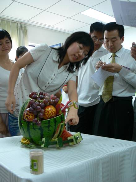 此次活動(dòng)邀請(qǐng)了所芝麻花餐廳的韓志偉經(jīng)理和莫海紅廚師作為評(píng)委。比賽開始之前,莫海紅廚師現(xiàn)場(chǎng)為大家表演了雕“龍頭”手藝,在場(chǎng)的同學(xué)都被莫廚師精湛的技藝所折服。此次共有10支隊(duì)伍參加了比賽,選手們經(jīng)過精心設(shè)計(jì),制作出了10份精美的水果拼盤,并分別取名為“科苑風(fēng)和”、“南極驢友”、“絕代雙花”、“和諧城市”、“椰島風(fēng)情”、“兩情相悅”、“愛的港灣”、“展翅高飛”、“中國(guó)加油”、“幸福之家”。通過評(píng)審,最終高巍、王惠娟、周靜小組的“幸福之家”榮獲一等獎(jiǎng),韓買興、劉欣創(chuàng)作的“椰島風(fēng)情”和周文、馮二媛創(chuàng)作的“兩情相悅”獲得二等獎(jiǎng),宋見、相海飛、劉術(shù)華創(chuàng)作的“南極驢友”,畢卉、田易創(chuàng)作的“和諧城市”,高海飛、陳政、吳元偉創(chuàng)作的“科苑風(fēng)和”則獲得三等獎(jiǎng)。