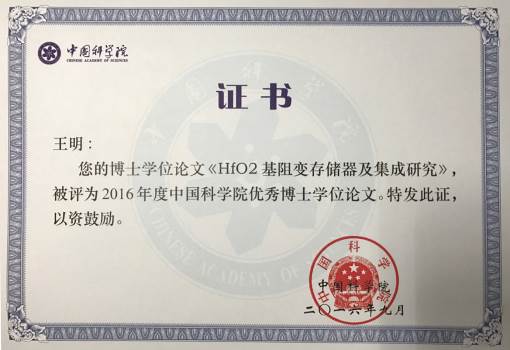 2016年,中國(guó)科學(xué)院共評(píng)選出100篇優(yōu)秀博士學(xué)位論文,王明的論文《HfO2基阻變存儲(chǔ)器及集成研究》獲此殊榮。“中國(guó)科學(xué)院院長(zhǎng)特別獎(jiǎng)”、“中國(guó)科學(xué)院院長(zhǎng)優(yōu)秀獎(jiǎng)”是研究生獎(jiǎng)學(xué)金中含金量最高的獎(jiǎng)項(xiàng)之一,設(shè)特別獎(jiǎng)50名、優(yōu)秀獎(jiǎng)300名。“朱李月華獎(jiǎng)”由香港金利豐集團(tuán)總裁朱李月華女士捐資設(shè)立,分為“優(yōu)秀博士生獎(jiǎng)”和“優(yōu)秀教師獎(jiǎng)”兩個(gè)獎(jiǎng)項(xiàng),旨在促進(jìn)我國(guó)科教事業(yè)的發(fā)展,獎(jiǎng)勵(lì)成績(jī)優(yōu)異的博士研究生和研究生教師。