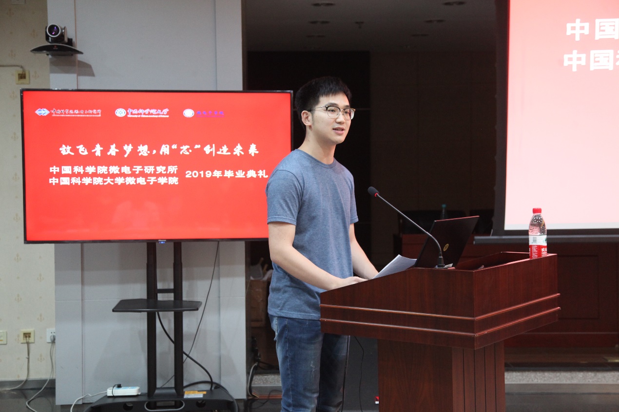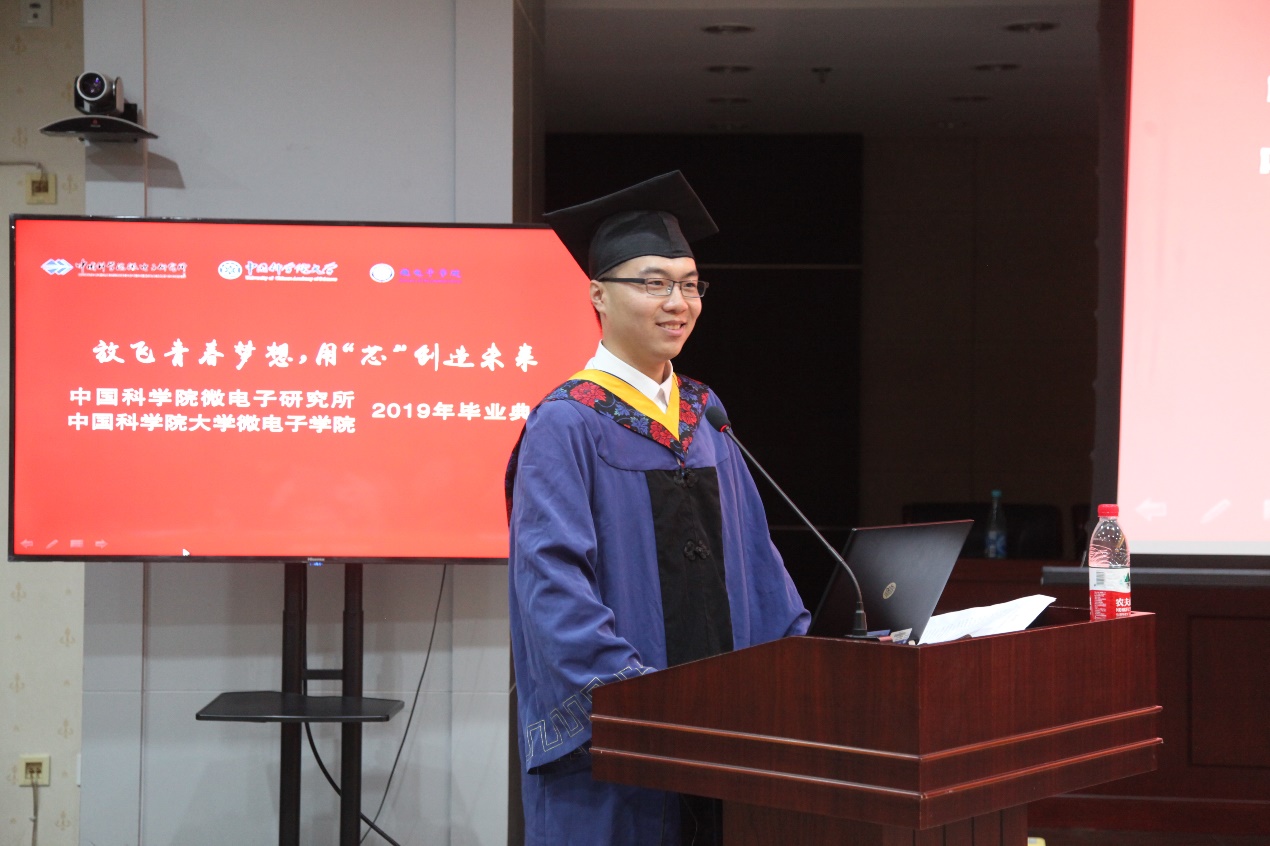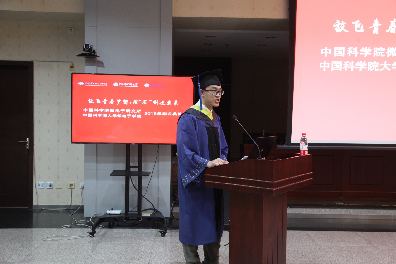 畢業(yè)典禮在雄壯的國歌中拉開序幕。科教融合中心副主任崔京宣讀了2019屆擬授予學位名單。畢業(yè)生代表周峰講述了求學期間科研收獲,表達了對培養(yǎng)單位和導師的感激。王玉岐作為微電子學院首屆企業(yè)定制班畢業(yè)生代表,分享了微電子學院產(chǎn)學研培養(yǎng)體系不斷完善的過程,表達了對微電子學院集成電路人才培養(yǎng)的信心。在讀研究生代表陳堯送出了對畢業(yè)師兄師姐真摯的祝賀和祝福。