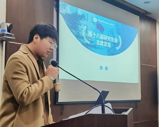 大會第四項,由十八屆研究生會主席鄭旭進行發(fā)言,鄭旭主席對上一屆研會成員的工作表達了高度認可和贊揚,并提出要牢牢把握承上啟下、開拓創(chuàng)新、團結(jié)協(xié)作的工作原則,在優(yōu)秀完成以往工作的基礎(chǔ)上,加大力度做好新媒體平臺,增加宣傳力度。