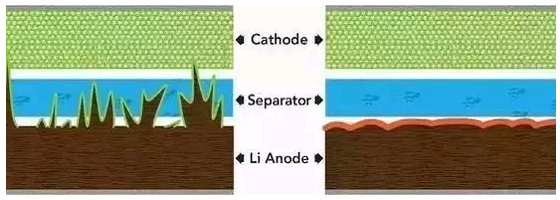 充電過程中, 由于金屬鋰電極表面凹凸不平,造成不均勻沉積,導(dǎo)致充電時析出鋰枝晶。當(dāng)枝晶生長到一定程度就會折斷,造成鋰的不可逆, 使電池充放電實際容量降低。鋰枝晶也有可能刺穿隔膜, 將正極與負(fù)極連接起來,造成內(nèi)部短路,產(chǎn)生大量的熱令電池著火甚至發(fā)生爆炸。由于鋰枝晶問題難以解決,鋰金屬二次電池發(fā)生多起起火事故,大部分企業(yè)退出金屬鋰二次電池開發(fā),尋找其他的解決方案,發(fā)展最成熟的當(dāng)屬鋰離子電池與鋰聚合物電池。