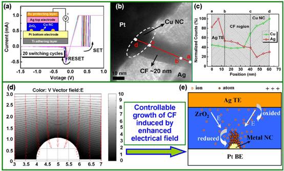 圖1、(a) Ag/ZrO2/Cu NC/Pt器件的電阻轉(zhuǎn)變曲線,插圖為器件結(jié)構(gòu)示意圖;(b) 導(dǎo)電細(xì)絲的TEM照片;(c)Ag和Cu元素的EDS線掃描強(qiáng)度,結(jié)果顯示Ag導(dǎo)電細(xì)絲生長(zhǎng)在Cu納米晶上;(d)電場(chǎng)分布模擬;(e)納米晶誘導(dǎo)細(xì)絲生長(zhǎng)的示意圖。