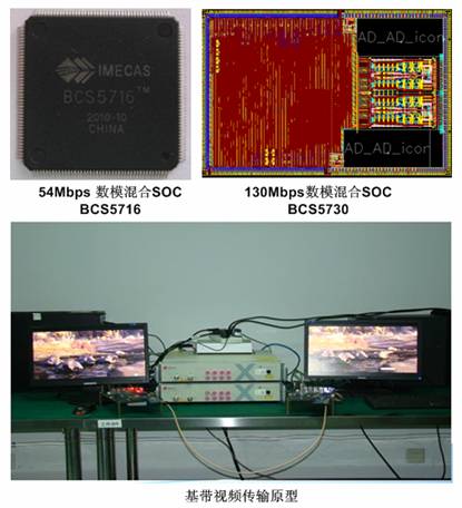 由二室寬帶通信系統(tǒng)實(shí)驗(yàn)室牽頭承擔(dān)的“面向IMT-Advanced等寬帶無線通信系統(tǒng)的數(shù)模混合集成電路研發(fā)”和聯(lián)合承擔(dān)的“超高速無線局域網(wǎng)無線接口關(guān)鍵技術(shù)研究與驗(yàn)證”重大專項(xiàng)課題,圍繞高速無線局域網(wǎng)802.11a/g/n及下一代超高速無線局域網(wǎng)802.11ac技術(shù)標(biāo)準(zhǔn)開展核心芯片的研發(fā),作為國內(nèi)最早涉足802.11n及802.11ac核心芯片研發(fā)的團(tuán)隊(duì),在2010年度取得顯著成果:從無到有的完成了802.11a/b/g/n全模式基帶算法和網(wǎng)絡(luò)協(xié)議棧平臺(tái),基帶傳輸原型系統(tǒng),完成包括54Mbps數(shù)模混合SOC,802.11n 2X2數(shù)模混合芯片BCS5730等三款芯片的研制,其中2X2基帶芯片含4個(gè)80MHz/10bit ADC,4個(gè)80MHz/10bit DAC,支持MIMO-OFDM技術(shù)的基帶處理器,物理層峰值吞吐率達(dá)130Mbps,是國內(nèi)公開報(bào)道的第一顆MIMO-OFDM基帶處理器芯片,在此領(lǐng)域積累大量核心知識(shí)產(chǎn)權(quán),并已開展與知名系統(tǒng)供應(yīng)商的合作,該成果為團(tuán)隊(duì)開展更高性能的無線局域網(wǎng)數(shù)模混合SOC的研發(fā)和產(chǎn)業(yè)化奠定良好的技術(shù)基礎(chǔ),是我國面向無線通信的高性能基帶數(shù)模混合集成電路設(shè)計(jì)領(lǐng)域的一大突破。