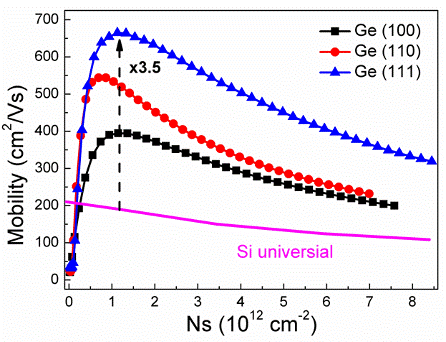 針對這個(gè)核心問題,中國科學(xué)院微電子研究所微波器件與集成電路研究室(四室)劉洪剛研究員帶領(lǐng)的研究團(tuán)隊(duì),通過對Ge表面進(jìn)行化學(xué)鈍化處理,然后進(jìn)行ALD-Al2O3的沉積,獲得了具有較低缺陷密度的界面。基于此方法,分別在Ge(100), Ge(110)和Ge(111)襯底上制造了Ge-pMOSFET,其空穴遷移率得到大幅度的提升 (圖1)。特別是在Ge(111)襯底上,通過化學(xué)鈍化,成功使得峰值遷移率達(dá)到660 cm2V-1s-1,該遷移率為體硅遷移率的3.5倍,達(dá)到了世界先進(jìn)水平。