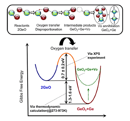 此外,該團(tuán)隊(duì)與日本東京大學(xué)鳥海研究小組合作,系統(tǒng)地研究了high-k/Ge界面的反應(yīng)機(jī)理。通過XPS表征的手法,首次闡明了GeO歧化反應(yīng)(2GeO→GeO2+Ge)以及GeO2/Ge界面處氧化還原反應(yīng)(GeO2+Ge→2GeO)的反應(yīng)機(jī)理,成功建立Ge及其氧化物體系的反應(yīng)動(dòng)力學(xué)模型(圖3)。相關(guān)成果發(fā)表在2012年8月份的應(yīng)用物理快報(bào)雜志上(S. K. Wang, H. G. Liu, A. Toriumi, Applied Physics Letters, 101, 061907 (2012))